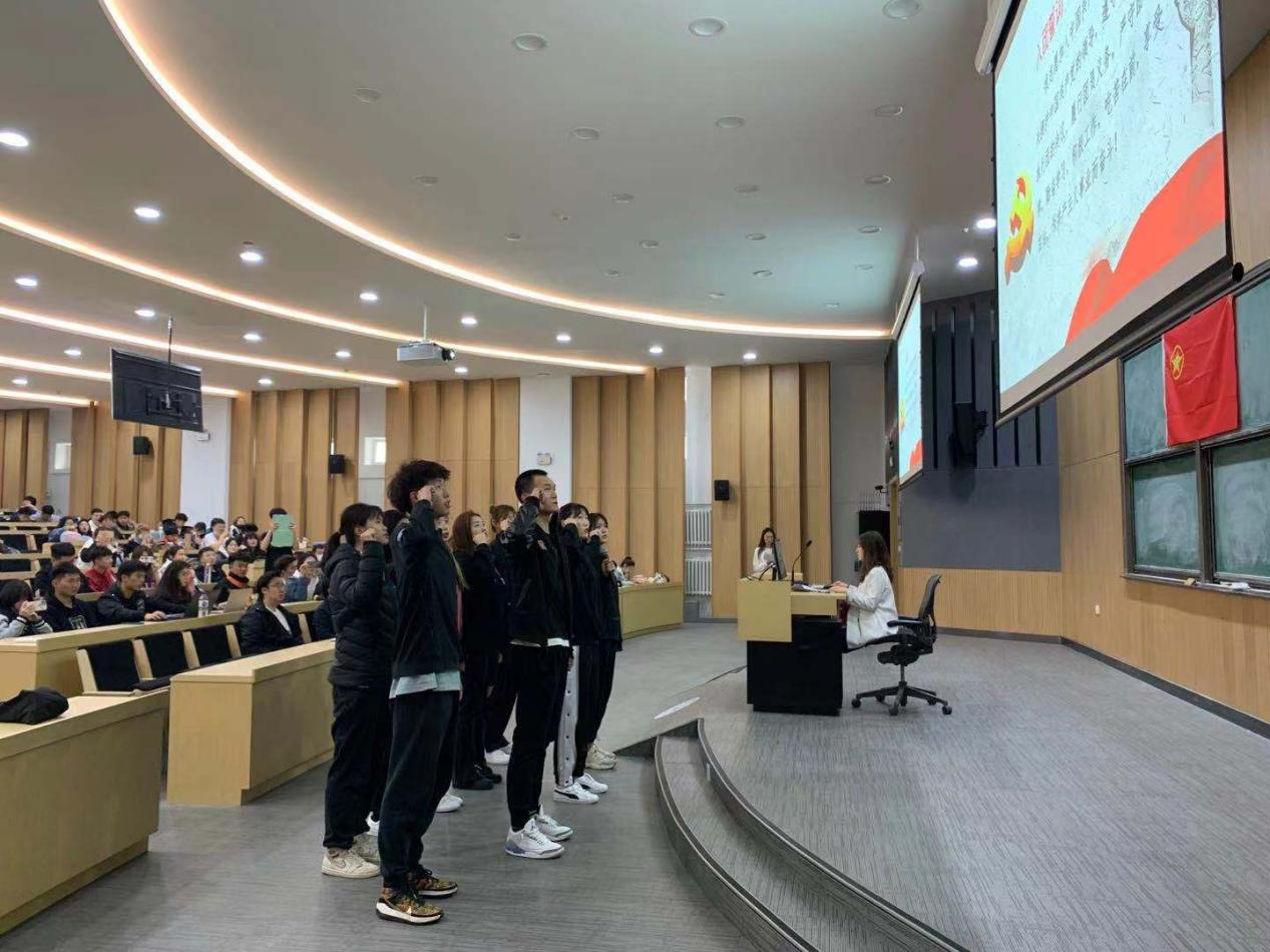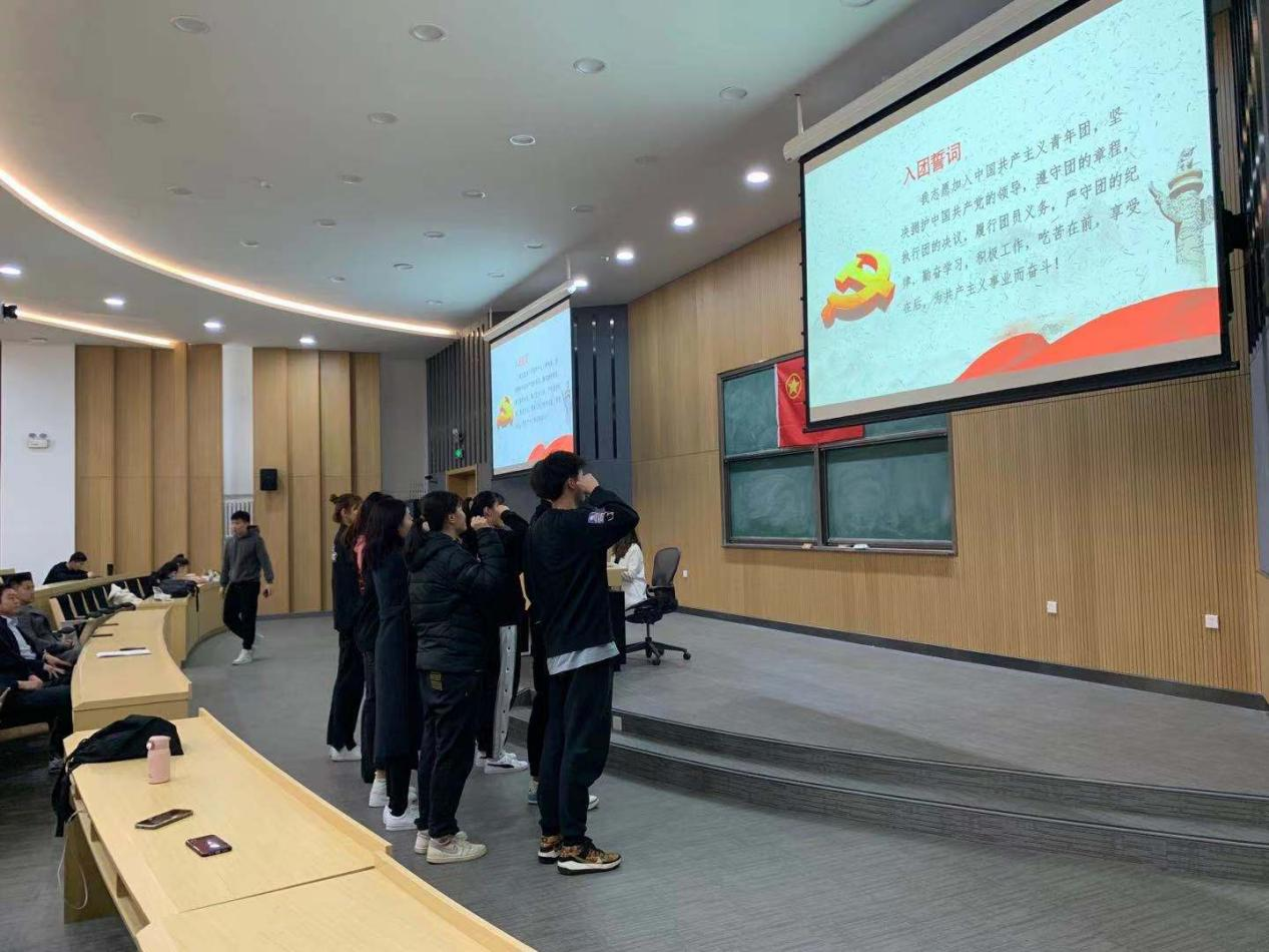 入团宣誓仪式开始,团学干部孙静涵同学带领全体新团员以最宏亮的声音,崭新饱满的精神面貌,面对团旗进行了庄严宣誓,向团组织表明决心。现场的团员们也通过重温誓词,牢记团的誓言,增强为共产主义奋斗的信念。宣誓仪式结束后,同学们从这一标志性的时刻开始,更好地发挥先锋模范带头作用,铭记在团旗下许下的誓言,努力学习,不畏艰难。